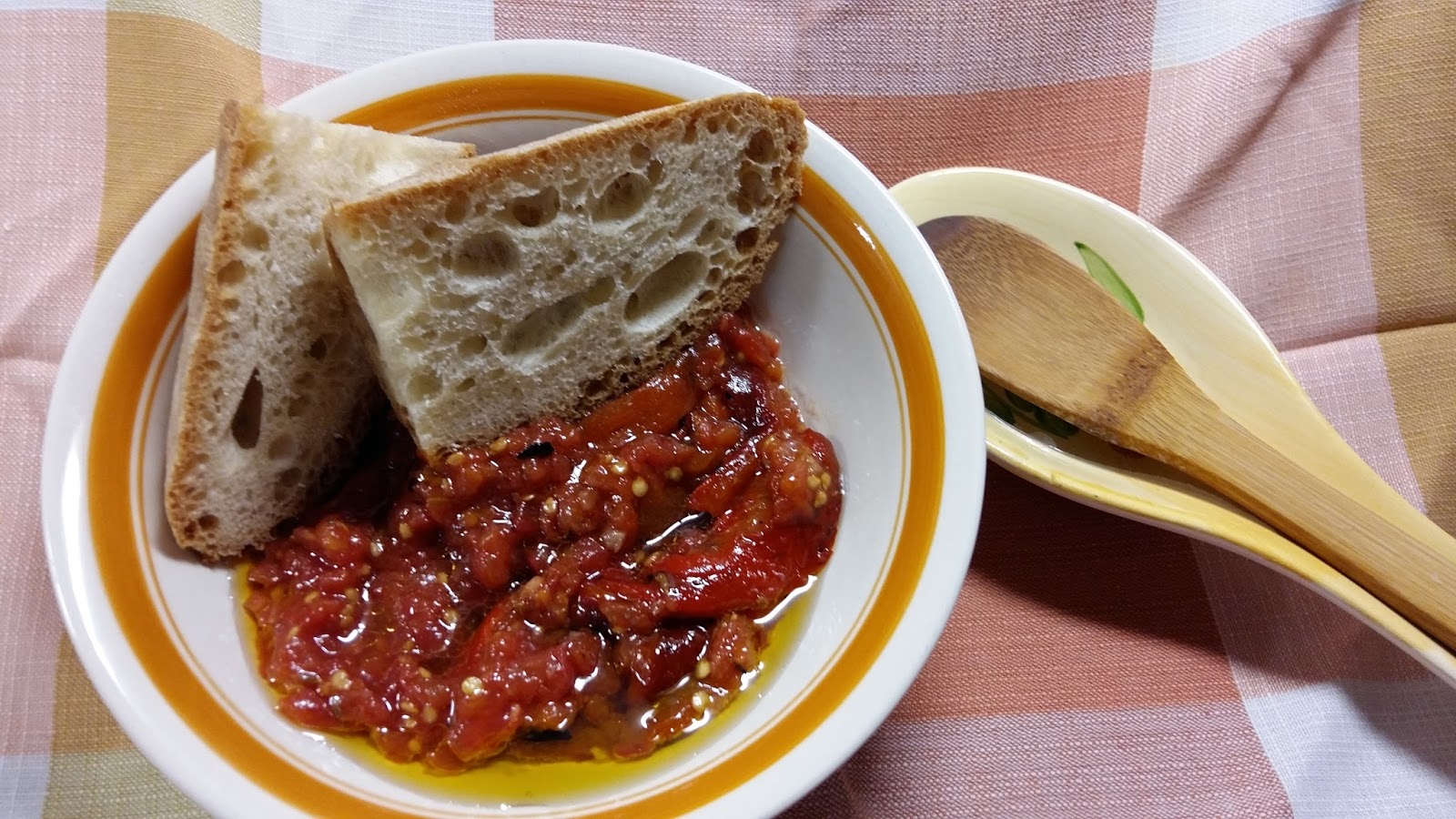 Para preparar el tomate frito, debemos pelar los tomates (que si son del tipo pera mejor) y los cortamos a cuadraditos bien pequeños, a continuación los ponemos en una sartén a «feir», pero sin nada de aceite, deben cocer durante almenos 20 minutos hasta que se haya consumido todo el jugo, pero vigilando que no se quemen. Dejamos enfriar y reservamos.