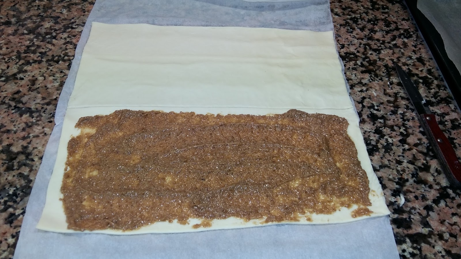 Ahora extendemos muy bien la preparación en una de las mitades de la lámina del hojaldre, vigilando que no haya mucho relleno para que no se esparza cuando preparemos las caracolas.