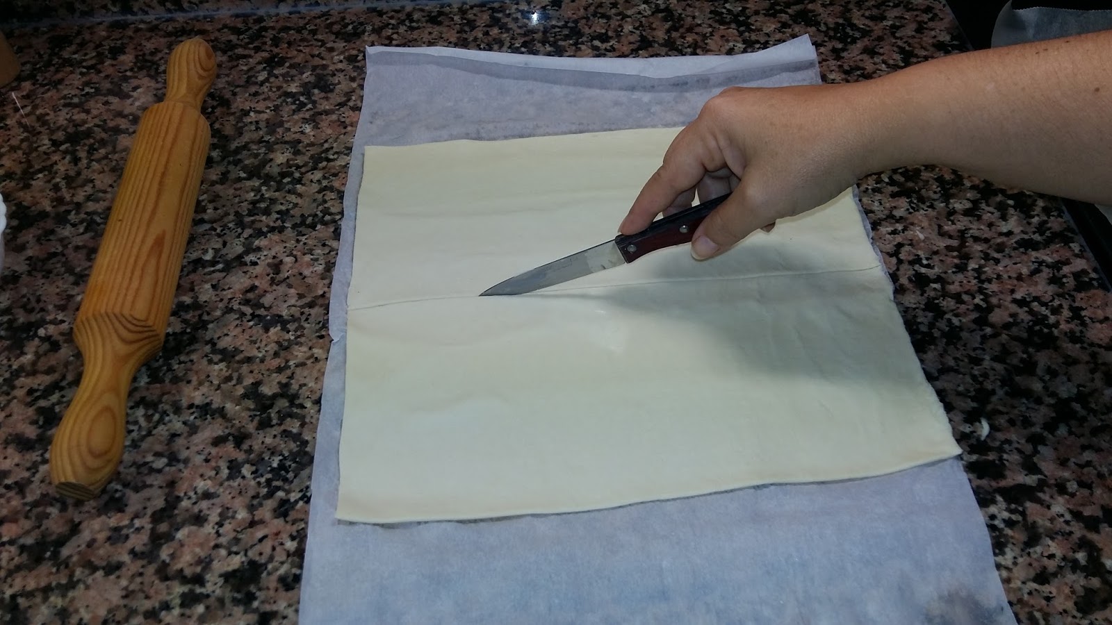 Extendemos la lámina de hojaldre y le pasamos el rodillo suavemente.