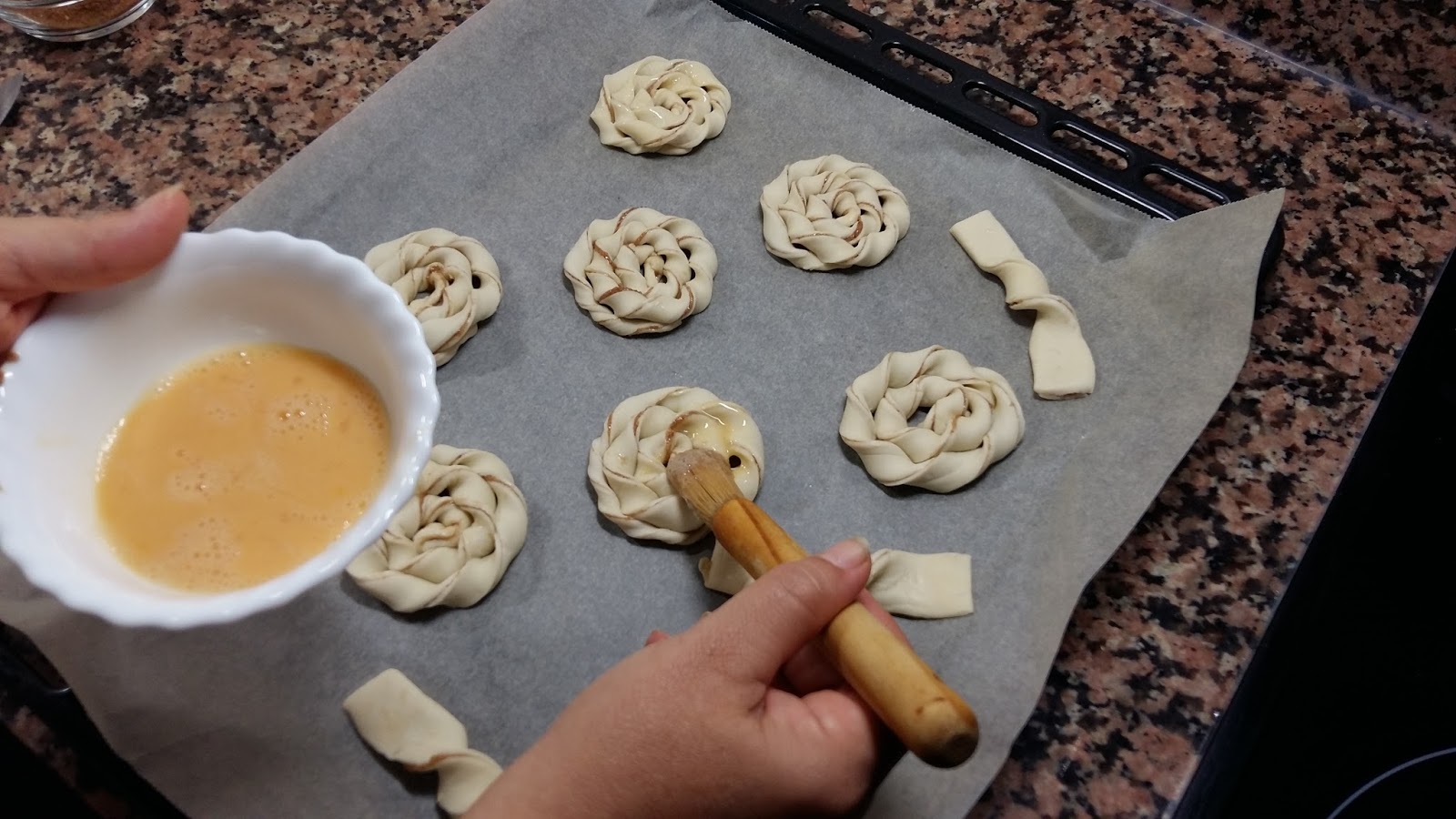 Las pintamos con el huevo batido, y las espolvoreamos con un poco de azúcar y canela.
