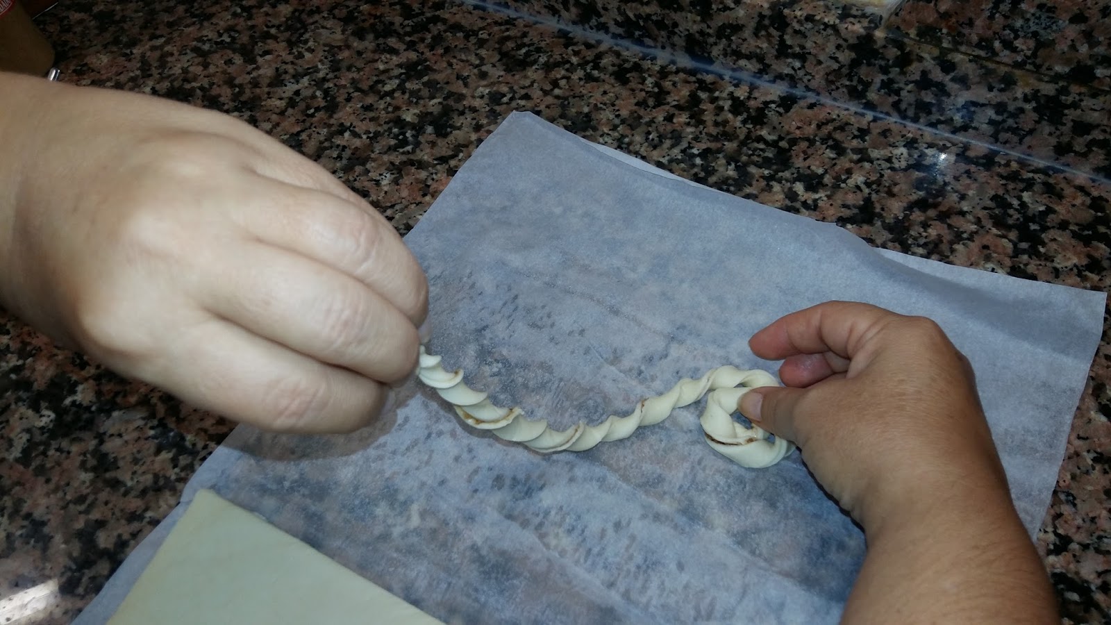 Sacamos de la nevera nuestro hojaldre relleno, y empezamos a preparar las caracolas, cortamos tiras a lo ancho de aprox. 1,5 cm, lo retorcemos sobre sí mismo y luego lo enrollamos en forma de espiral.