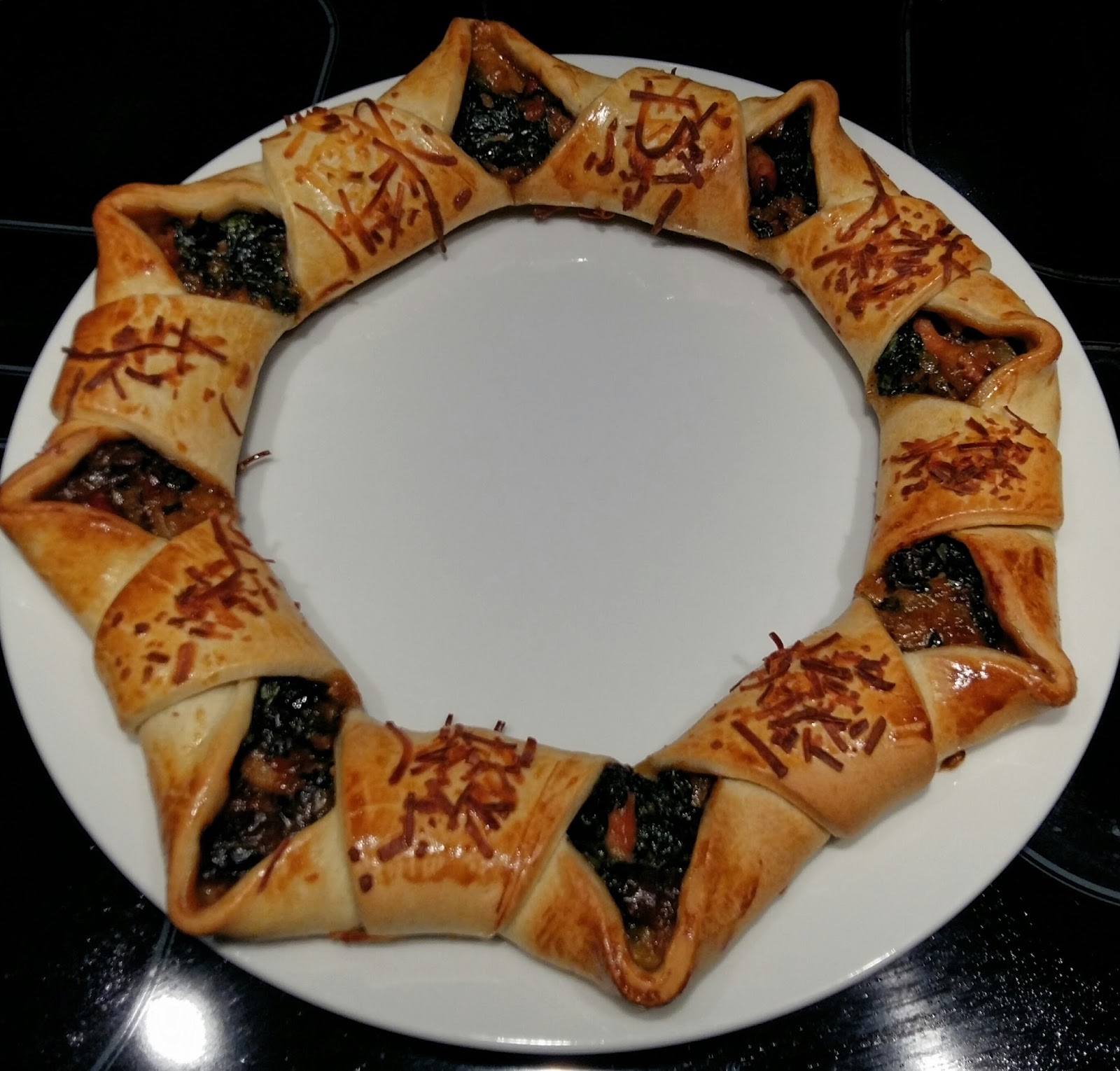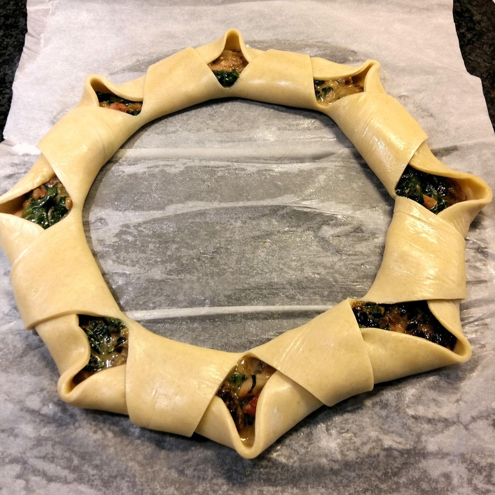 Colocamos en todo el borde el rellenos previamente preparado y vamos doblando para preparar la corona.