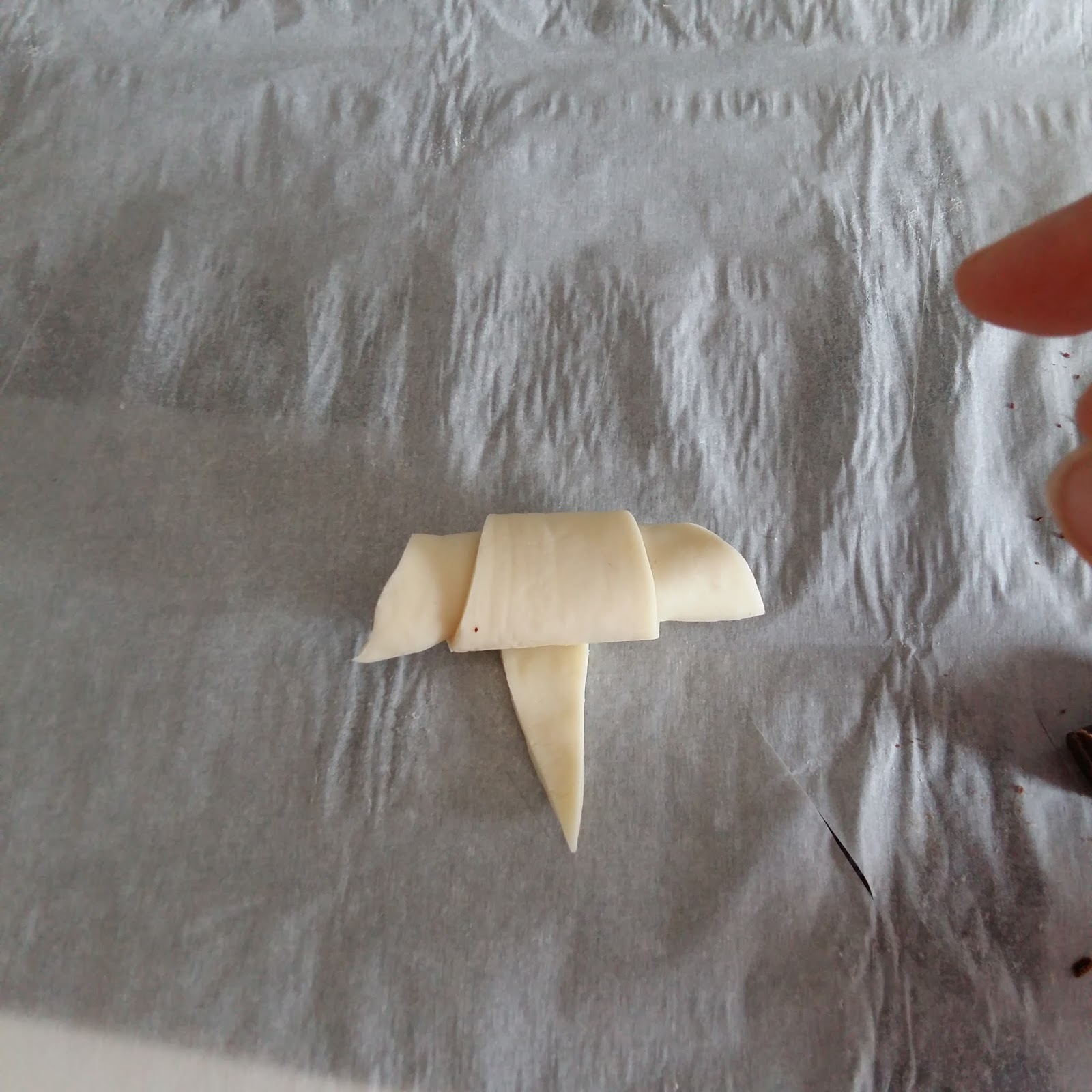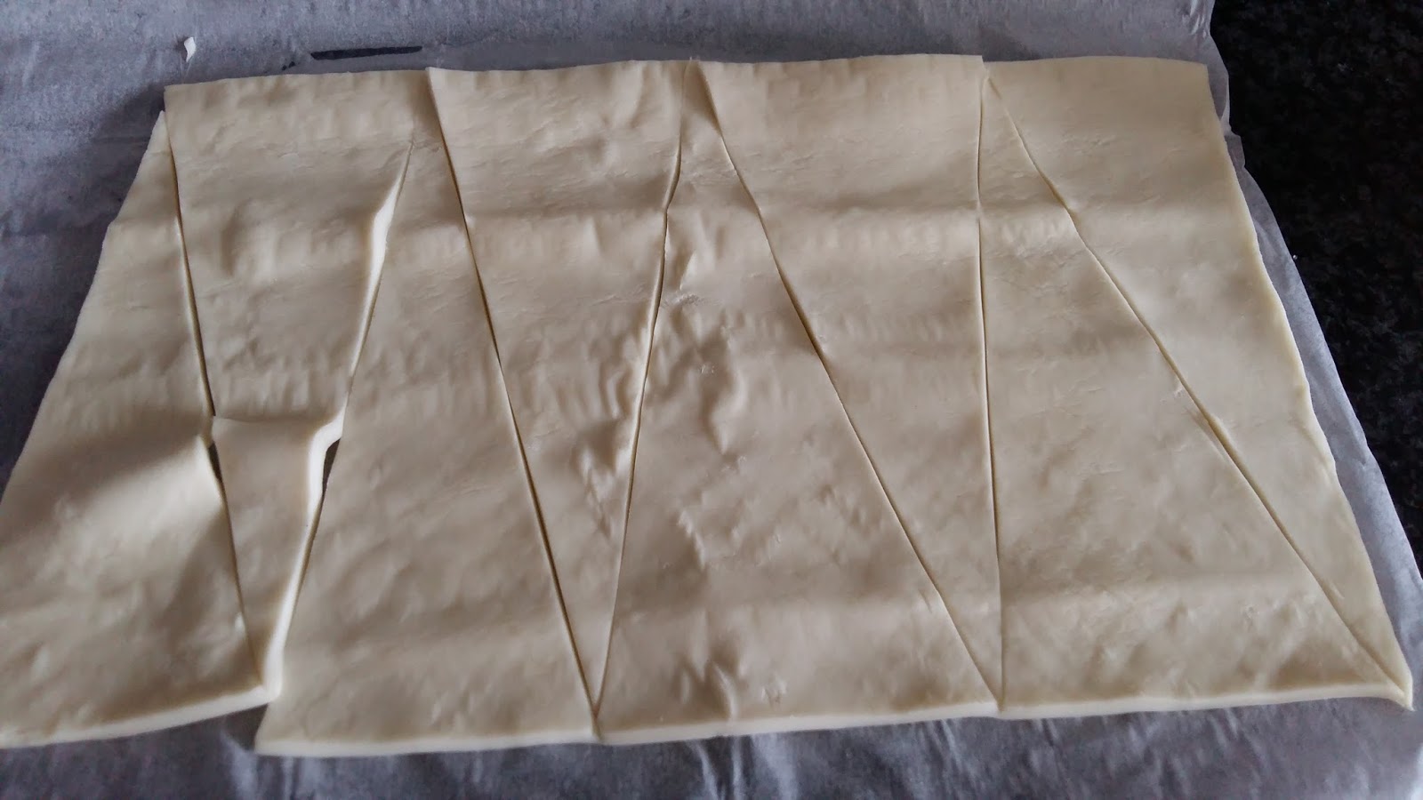 Extender la lámina de hojaldre pero no presionar en absoluto, cortar con un cuchillo bien afilado por la mitad, y luego cortar porciones en forma de triángulos como los de la foto.