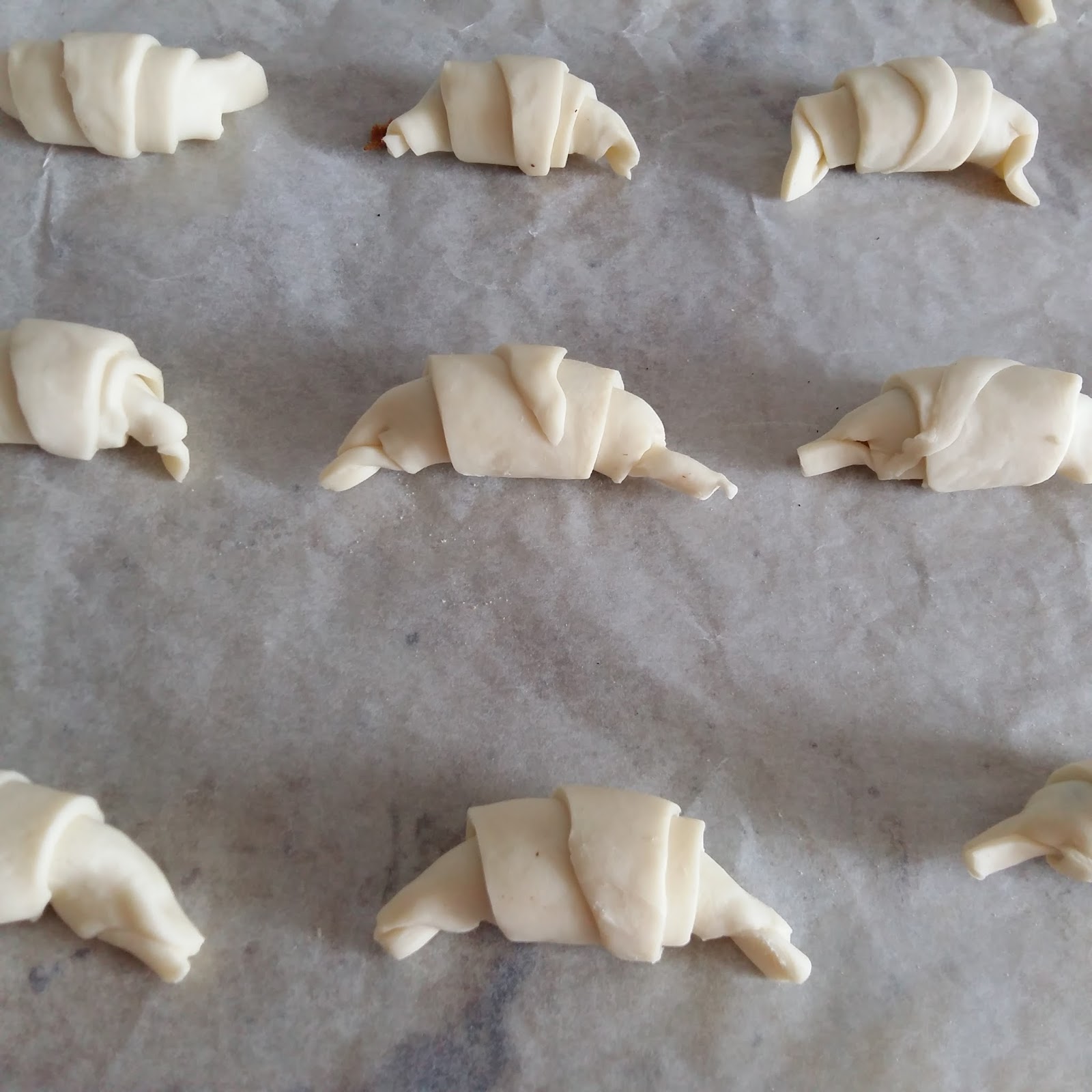 Cerramos las puntas de los croisants, dándole forma de luna. Los pintaremos con huevo batido y los espolvoreamos con azúcar blanco.