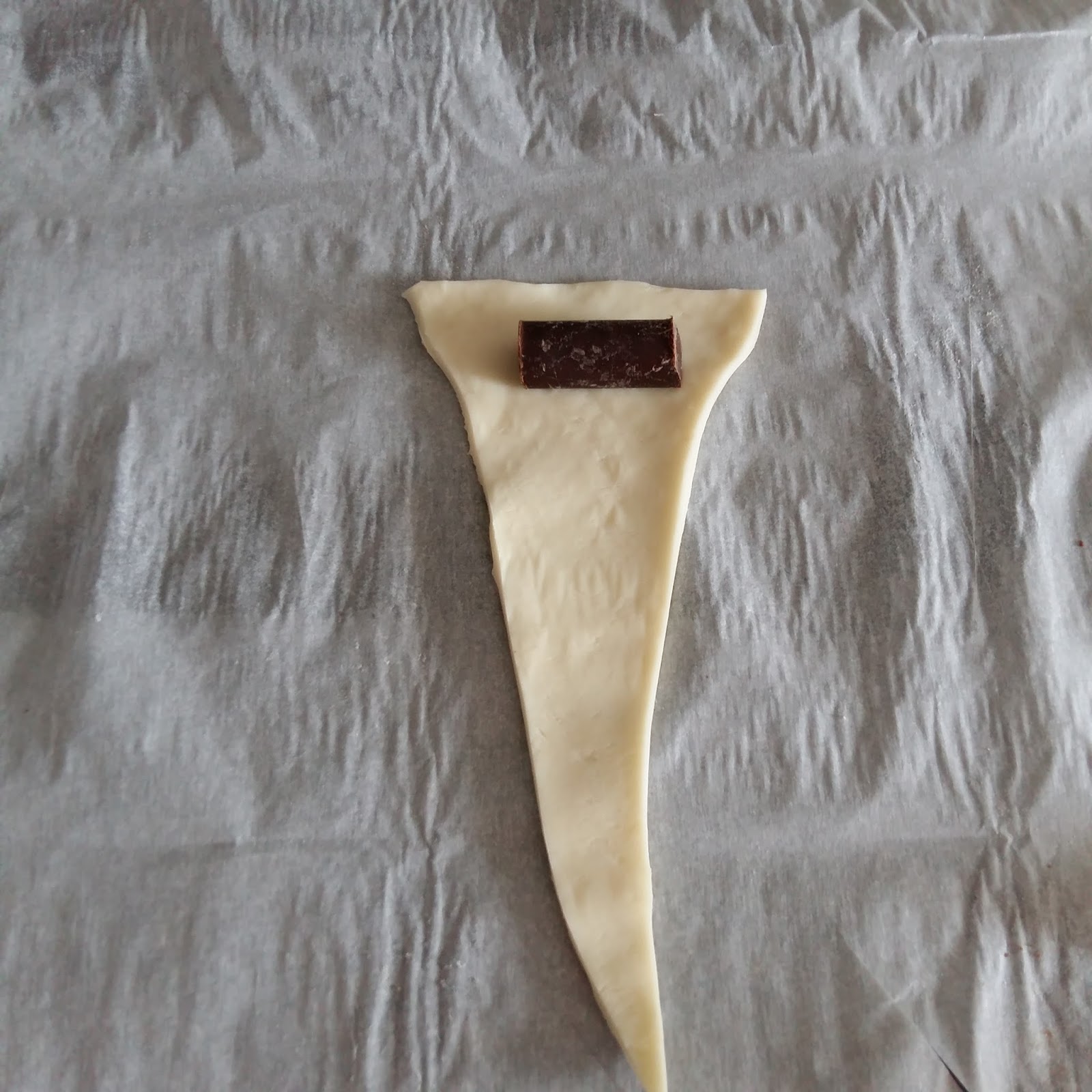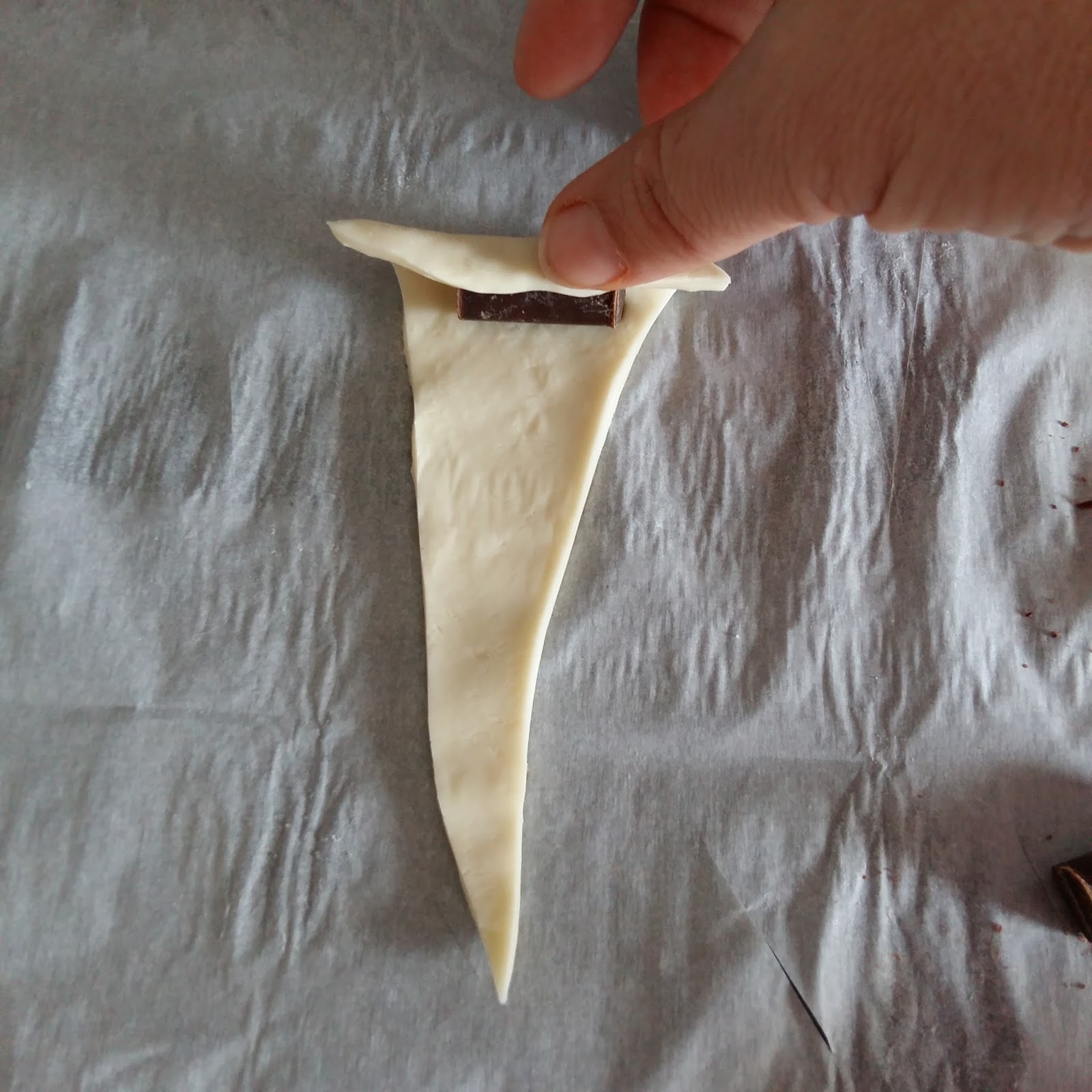 De cada triángulo haremos un mini croisant, lo cogemos con la mano y estiramos ligeramente de la parte puntiaguda, le colocamos una porción de chocolate y enrollamos en forma de croisant.