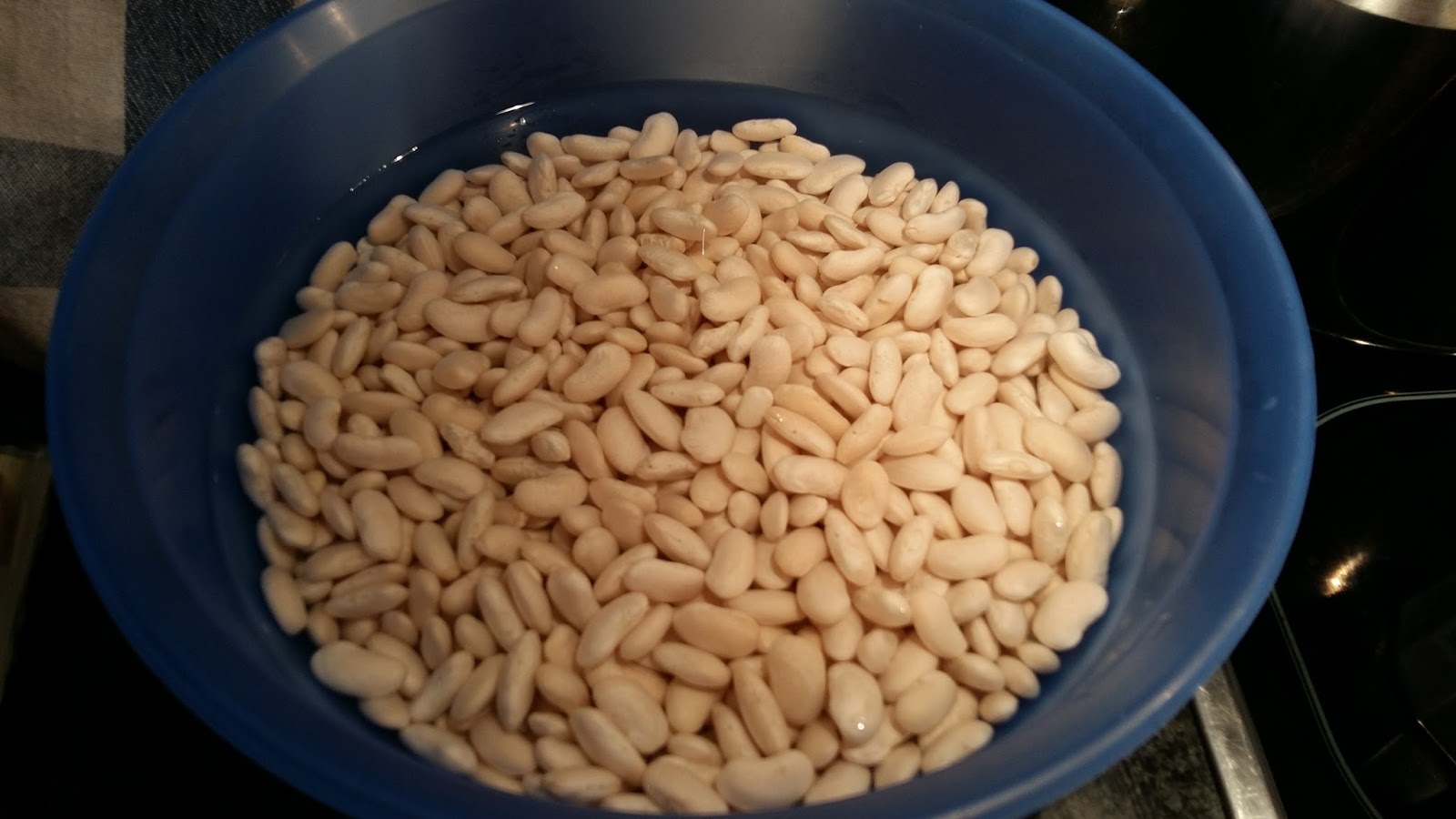 La noche anterior se ponen a remojo las alubias en agua a temperatura ambiente, y cubriéndolas generosamente, porque cuando engorden no se queden sin agua.