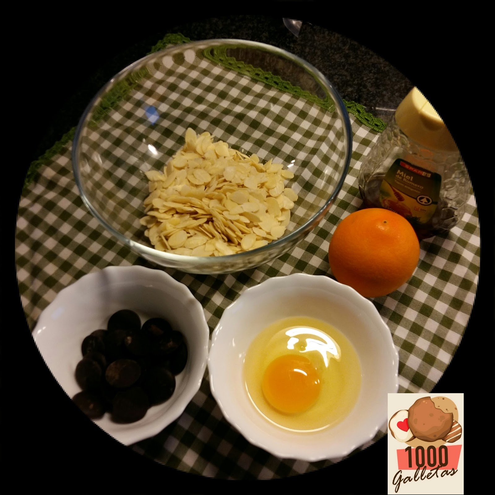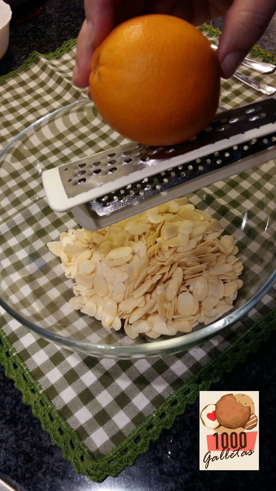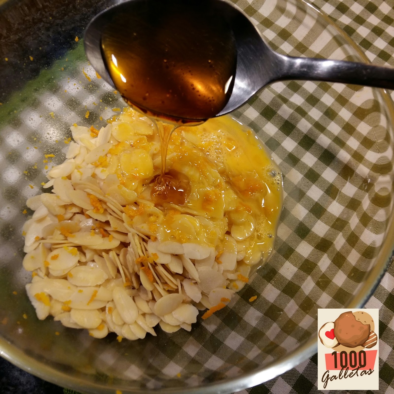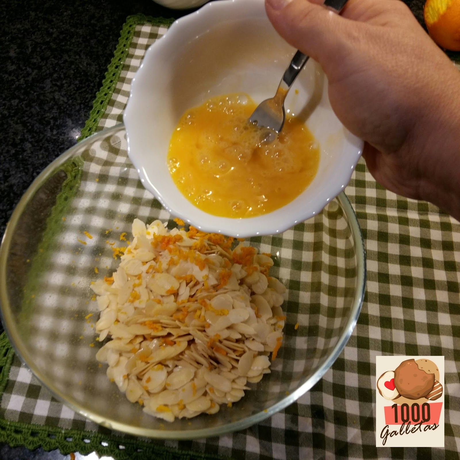 Mezclar todos los ingredientes, empezamos con las almendras laminadas, la ralladura de una naranja, 1 huevo batido y la cucharada de miel.