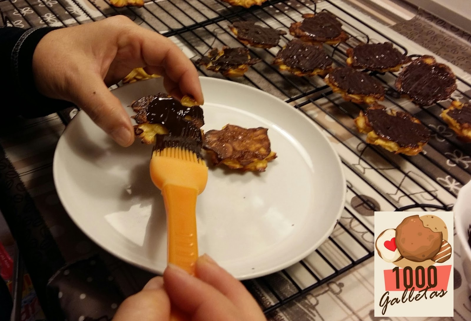 Iremos preparando el chocolate, fundiéndolo en el microondas o bien a baño maría. Cuando esté es su punto, y con las galletas totalmente frías, ya podemos pintar la parte posterior de cada galleta con el chocolate fundido.