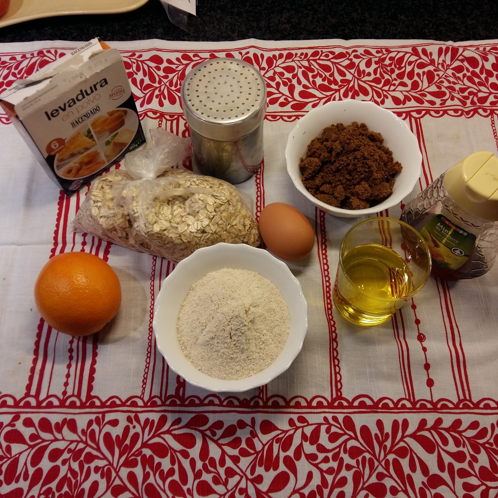 Mezclar bien en un bol todos los ingredientes secos, la ralladura de la piel de 1 naranja, los copos, la harina, el azúcar, la levadura y una pizca de sal.