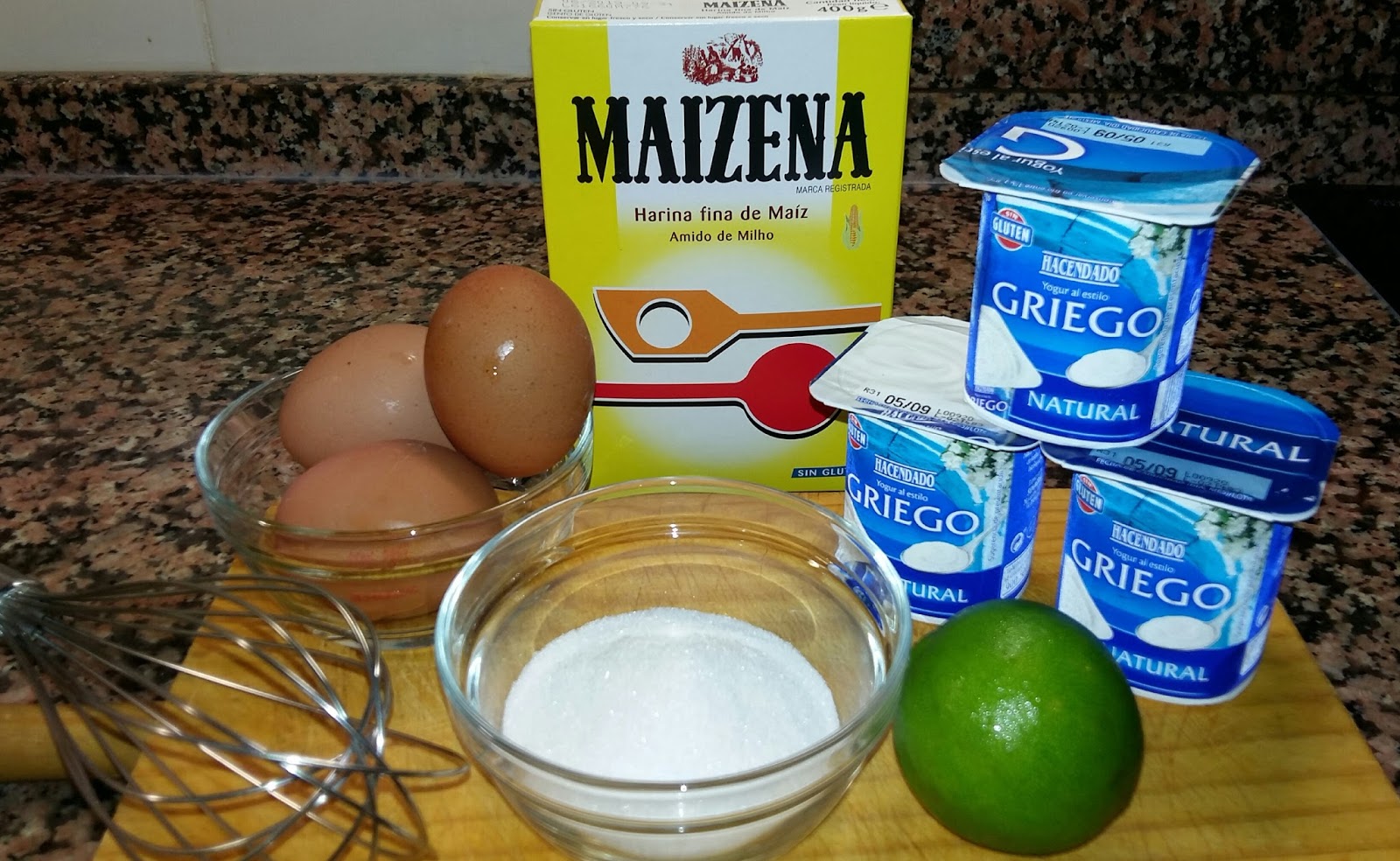 Batimos bien las yemas de los huevos con el azúcar, seguidamente añadimos el resto de elementos , empezando por los yogures, cuando estén integrados añadimos el jugo de 1/2 limón y por último la Maicena, hasta conseguir una mezcla bien homogénea.