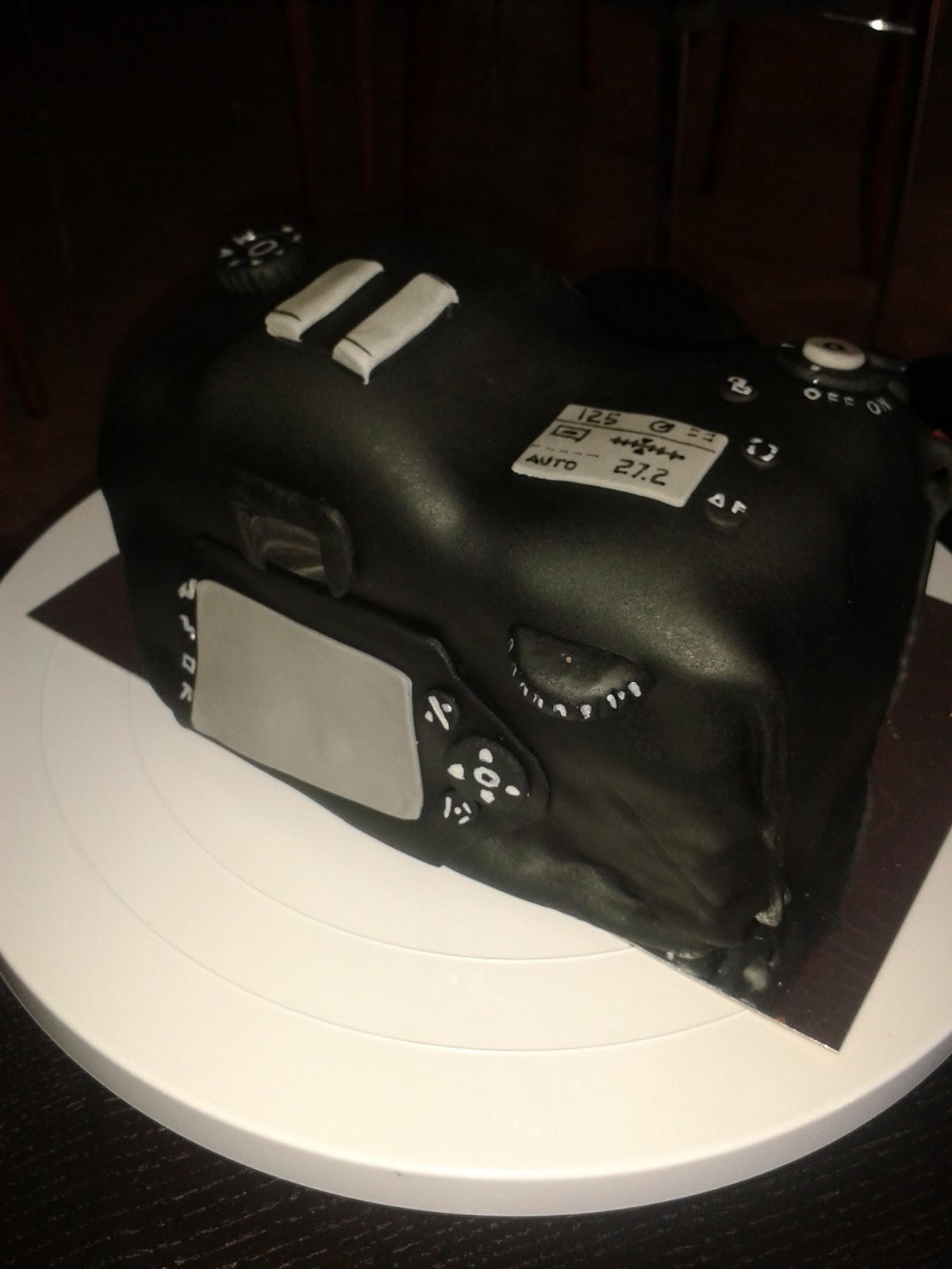 Estudié un poco que tipo de cámara hacer, primero pensaba hacer una decoración plana en fondant, pero eso era muy fácil, y al final me decidí por una tarta 3D de una Cámara Nikon. (En eso me ayudó a decidir mi marido, al que también le gusta mucho la fotografía, me dijo que sería muy espectacular)