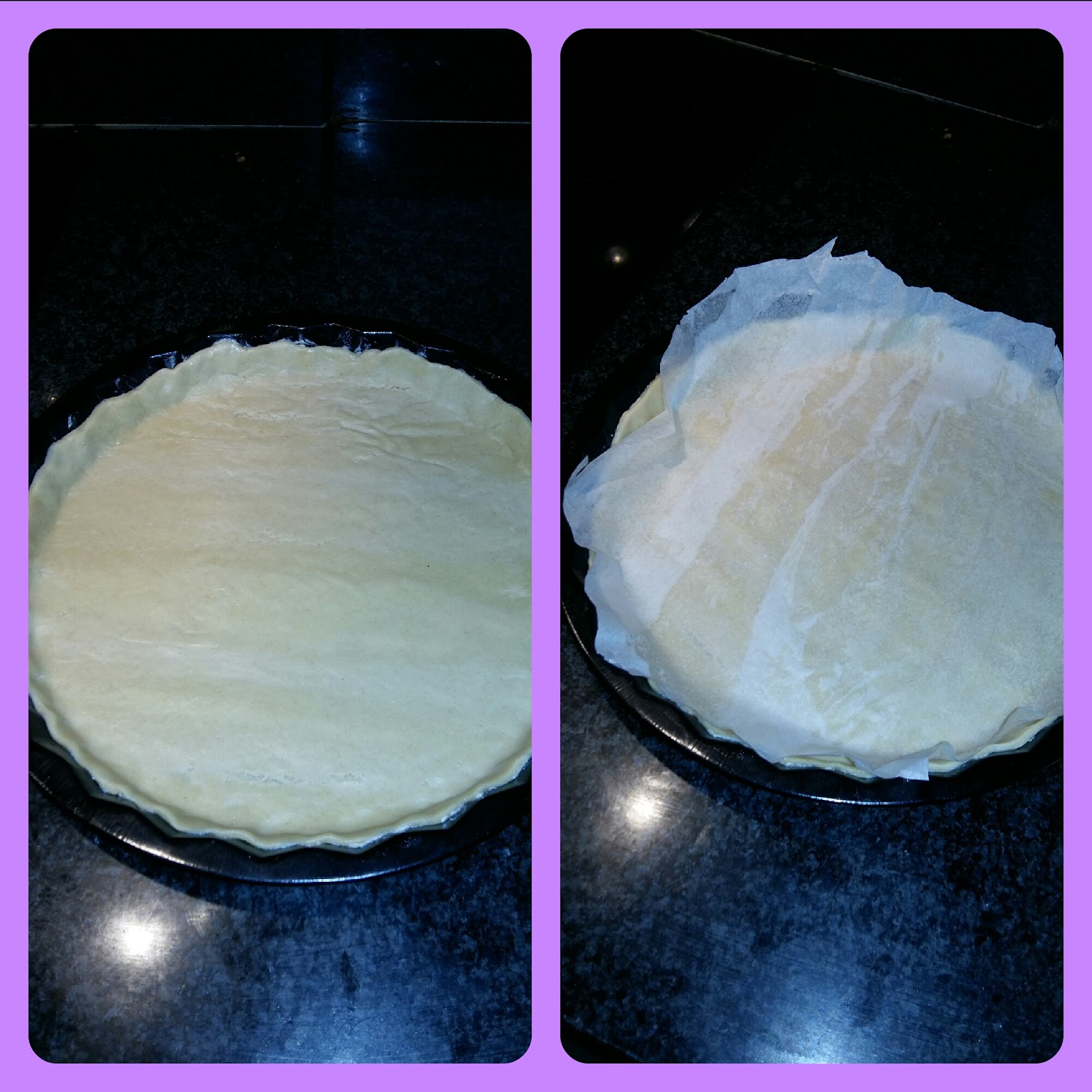 Vamos a preparar la base de la tarta. Extendemos la lámina de pasta en un molde previamente engrasado, no estiramos, pinchamos con un tenedor todo el fondo de la tarta. Recortamos un papel de hornear y lo colocamos en el fondo, y lo ponemos en el congelador durante 10 minutos.