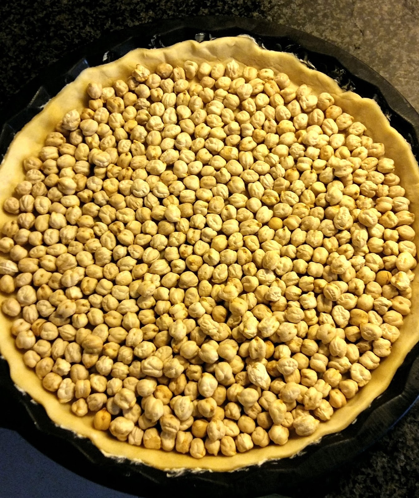 Sacamos del congelador la masa y cubrimos el papel de hornear con garbanzos secos, que nos ayudaran a que no se suba la masa.