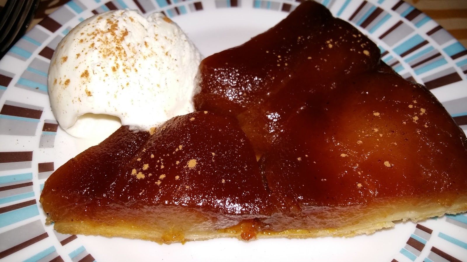 Dejamos enfriar un poco y seguidamente le damos la vuelta a la sartén para presentar la tarta. Se debe servir ligeramente caliente, y con una bola de helado de tu gusto, pero los que yo considero que le van mejor son de nata, vainilla o leche merengada.