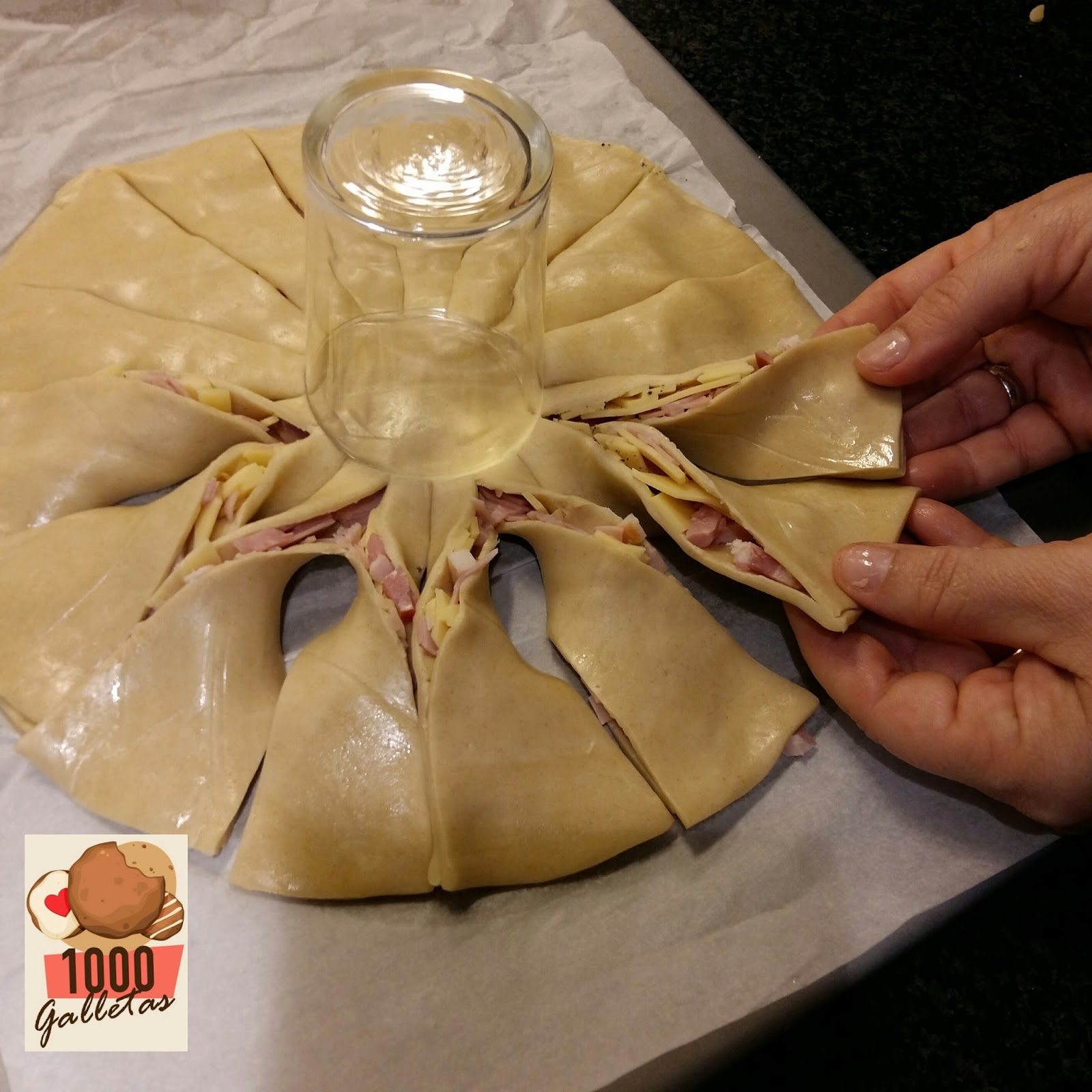 Cubrimos con la otra lámina de pasta y colocamos un vaso en el centro para proceder a realizar los cortes tal como veréis en la foto, es decir dividimos la tarta en 16 porciones.